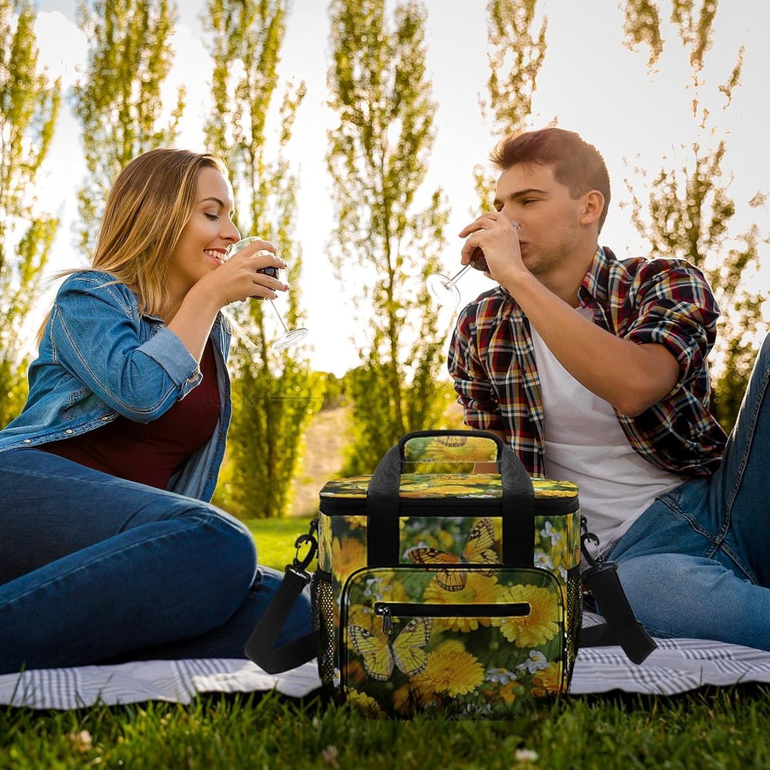 Versatile design: The Yellow Butterfly And Yellow Daisies print travel cooler bag stylish, gender-neutral design is suitable for all ages and occasions, whether for work, gym, outdoor events, or travel.Perfect for every occasion: This insulated food bag is not just for camping, rugged cooler bag is an excellent choice for everyday use, such as meal prep, lunch at work, grocery shopping, and more.Space-Saving design: The stand-up structure of the outdoor lifestyle bag saves space and makes it easy to store when not in use, insulated grocery bag perfect for compact packing.Machine washable: The reusable lunch bag is easy to maintain, food organizer bag is washable, but avoid prolonged soaking or bleaching to preserve its quality.