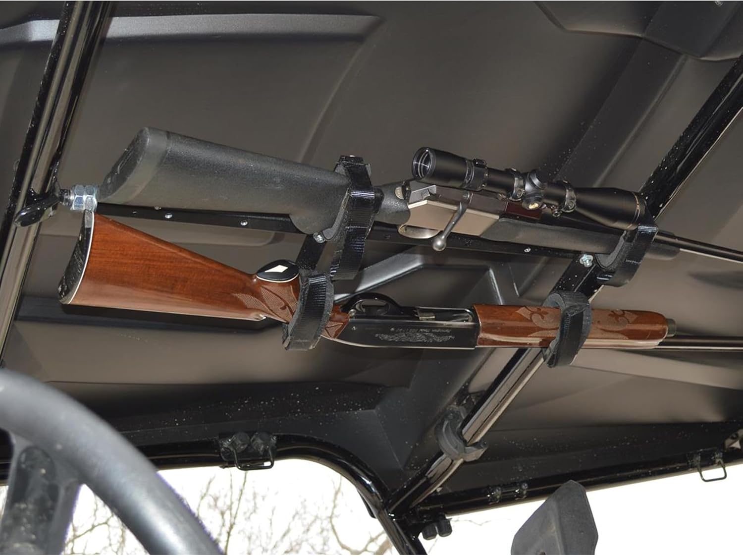Transform your UTV into a hunting-ready command center with the Great Day QD859-OGR-CC Quick-Draw Overhead Gun Rack. Precisely engineered to fit UTVs with roll-bar depths between 27 and 33 inches, this overhead-mounted rack provides a secure, easily accessible place for two firearms. Installation is a breeze—thanks to a tool-free, no-drill setup, you can have your rack positioned and ready in no time. Once in place, the super-soft rubber clips hold your firearms snugly without damaging finishes. Constructed with aircraft-grade aluminum and a powder-coated finish, the rack withstands the rigors of rugged outdoor use while remaining lightweight. Proudly made in the USA. Safety Reminder: Never transport a loaded firearm in the Quick-Draw Overhead Gun Rack. Important Fitment Note: Confirm your UTV has front-to-back roll-bar measurements between 27–33 inches before purchasing. Accuracy here ensures a flawless, secure fit. HOW TO INSTALL: 🔧 Identify UTV Fit: Measure your UTV’s inside upper roof frame to confirm it falls within the 27 to 33 inch range 🔧 Attach Gun Clips: Fasten the rubber gun clips to the mounting bar and adjust their positions to suit your firearms 🔧 Position Rack: Lift and align the rack in the overhead space between the front and rear roll bars 🔧 Secure and Adjust: Extend or retract the adjustable rod until the rack fits tightly. Hand-tighten for a firm grip—no tools required 🔧 Load Firearms: Carefully place your guns into the gun clips 🔧 Strap Guns: Use the Velcro straps to wrap around and secure the firearms tightly 🔧 Verify Stability: Shake lightly to ensure the rack and firearms are stable before driving